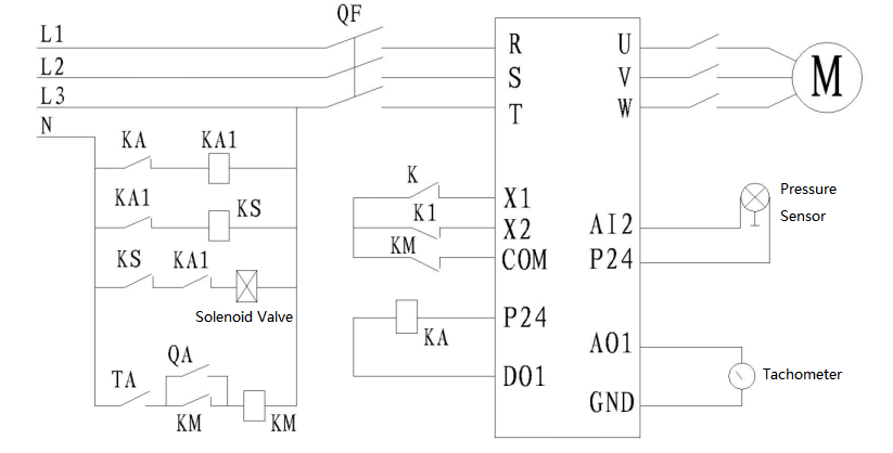 For these problems,we can use variable frequency and regulate speed technology realize control constant supply air.Pressure of pipe network as control object, pressure transmitter (YB)convert pressure in air storage to electric signal,and send to PID intelligent regulator,compare with set pressure(P0),account under set PID control method base on difference value,occur control signal and send to inverter,inverter control frequency and revolution speed of motor,so actual pressure always close to set pressure(P0).We can add power frequency and variable frequency switch functions in this scheme,retain former control and protection system.If use this scheme,motor of compressor from idle state to revolution work can start via inverter,realize soft start,avoid mechanical shock from surge current and starting.