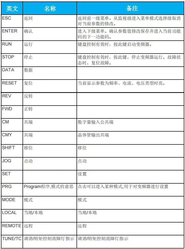 在工作中我们经常遇到各式各样的变频器,很多采用英文面板,虽然有的厂家标注了英文和汉字,但是也会遇到全英文面板,所以要学习变频器调试,了解英文按键以及指示灯处的英文含义非常有必要!下面总结了常见的英文含义以及部分按键功能。