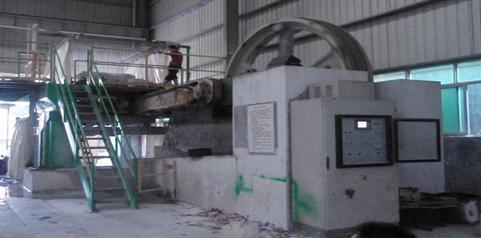 该设备的主电机通过皮带传动到直径为4m左右的大轮子上,然后在通过大轮轴上的偏心轮和一个长臂带动一组排锯。通过偏心轮的转动带动带锯前后运动切割石块。